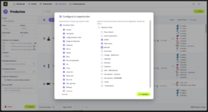 - Se abrirá un cuadro de diálogo donde vas a poder configurar la exportación seleccionando los campos que quieras incluir (nombre, descripción, categoría, marca, modelo, etc.).