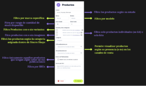 Permite filtrar los productos según su estado dentro de Sincro Shops.